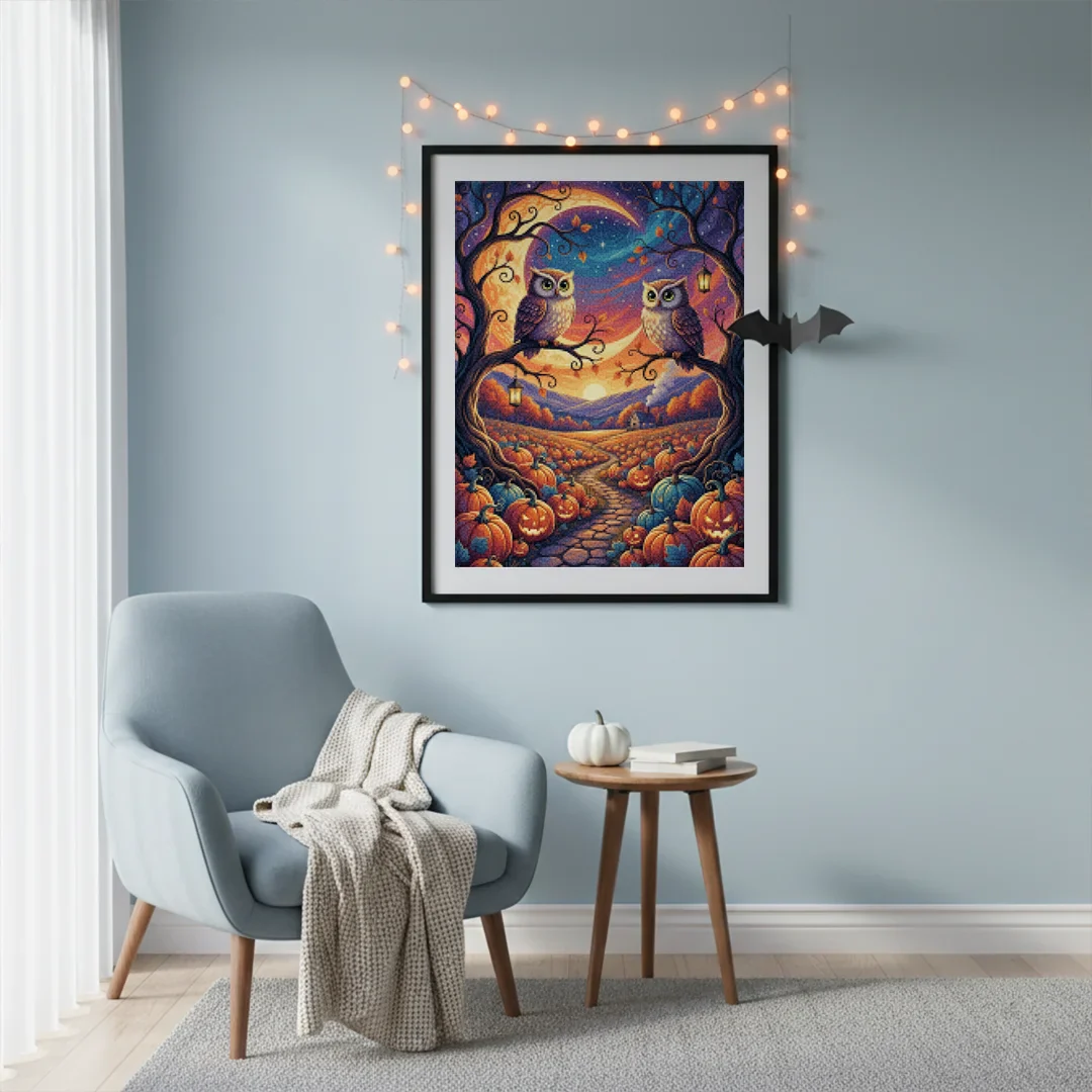 ¿Estás buscando una salida creativa, una actividad divertida para toda la familia? Esto es posible con nuestro set completo y profesional de Diamond Painting – Búhos en el huerto de calabazas. Con él podrás crear los más bellos cuadros en casa. El lienzo de alta calidad y transparencia te permite realizar una obra de arte impresionante en poco tiempo. Libera tu creatividad con tus propias creaciones. Diamond Painting es el pasatiempo perfecto para ti solo o para disfrutar en familia.