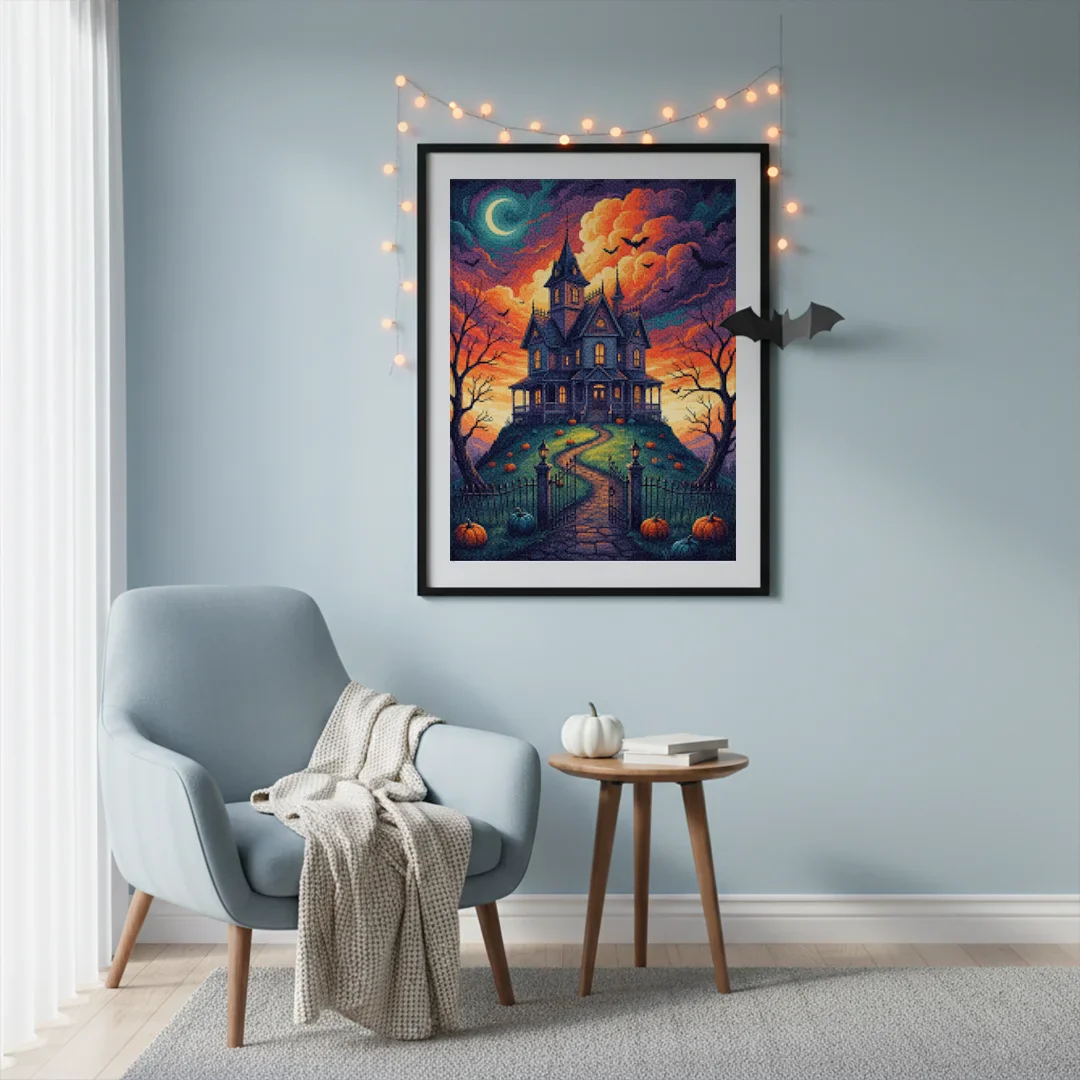 ¿Estás buscando una salida creativa, una actividad divertida para toda la familia? Esto es posible con nuestro set completo y profesional de Diamond Painting – Mansión encantada en la colina. Con él podrás crear los más bellos cuadros en casa. El lienzo de alta calidad y transparencia te permite realizar una obra de arte impresionante en poco tiempo. Libera tu creatividad con tus propias creaciones. Diamond Painting es el pasatiempo perfecto para ti solo o para disfrutar en familia.