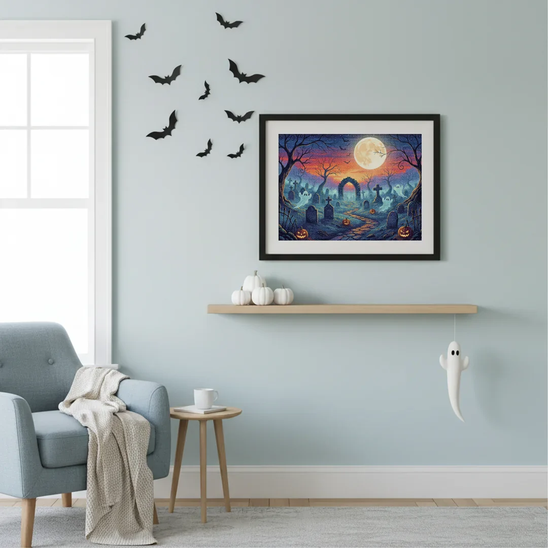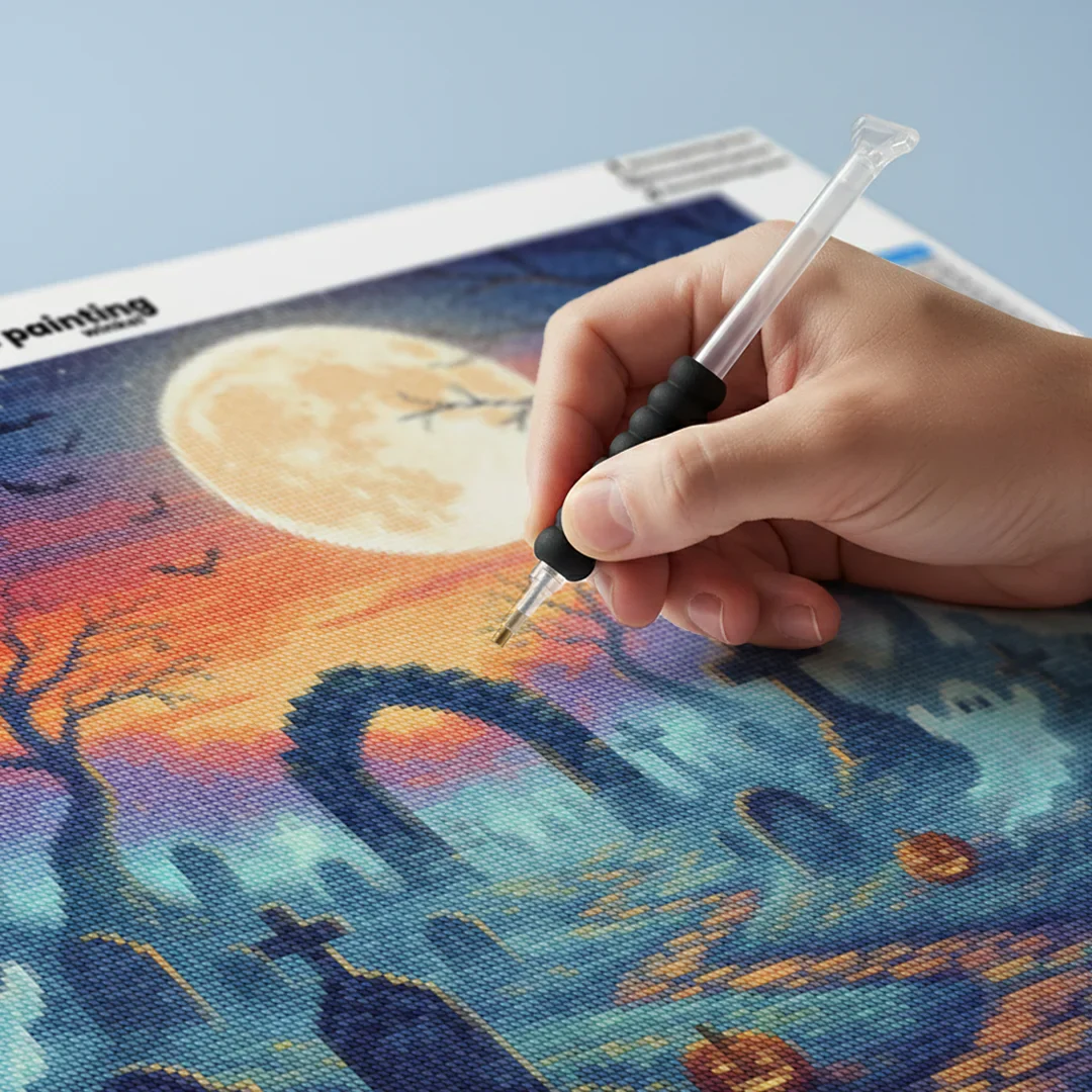 ¿Estás buscando una salida creativa, una actividad divertida para toda la familia? Esto es posible con nuestro set completo y profesional de Diamond Painting – Niebla espeluznante en el cementerio. Con él podrás crear los más bellos cuadros en casa. El lienzo de alta calidad y transparencia te permite realizar una obra de arte impresionante en poco tiempo. Libera tu creatividad con tus propias creaciones. Diamond Painting es el pasatiempo perfecto para ti solo o para disfrutar en familia.