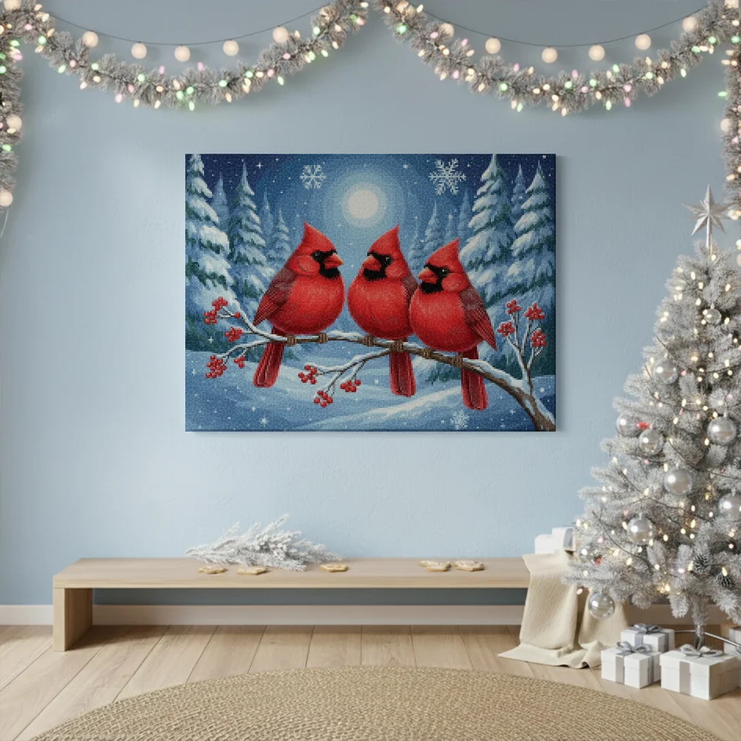 ¿Estás buscando una salida creativa, una actividad divertida para toda la familia? Esto es posible con nuestro set completo y profesional de Diamond Painting – Pájaros cardenales en una rama escarchada. Con él podrás crear los más bellos cuadros en casa. El lienzo de alta calidad y transparencia te permite realizar una obra de arte impresionante en poco tiempo. Libera tu creatividad con tus propias creaciones. Diamond Painting es el pasatiempo perfecto para ti solo o para disfrutar en familia.