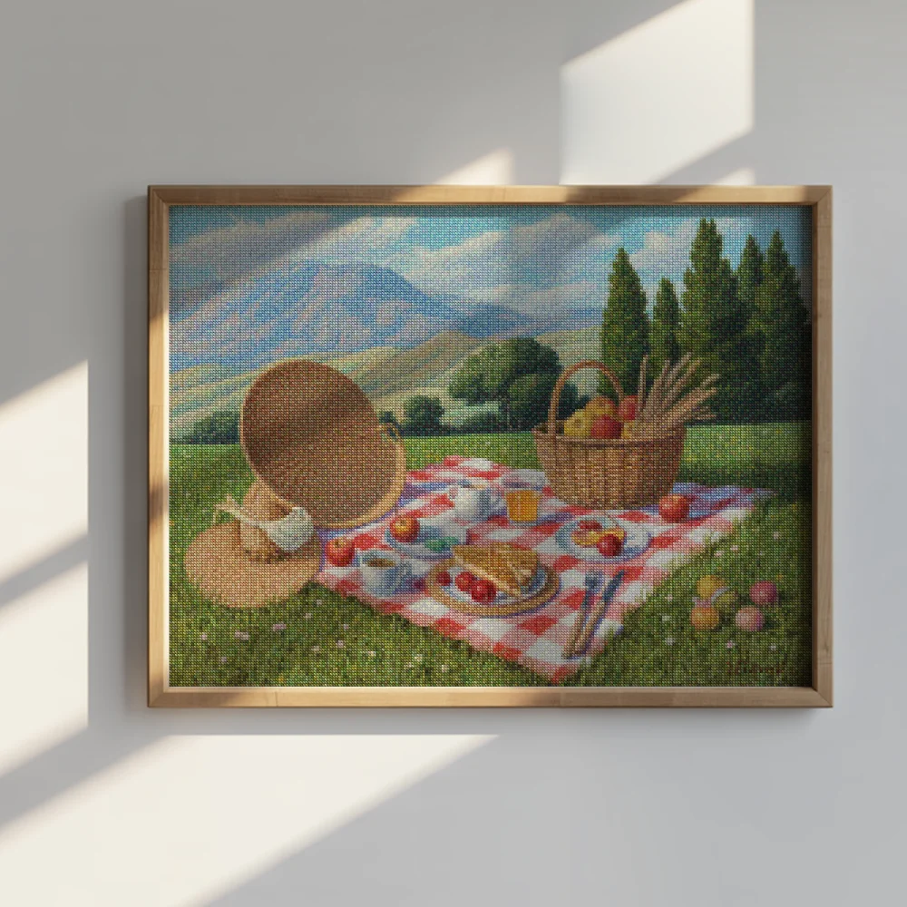 ¿Estás buscando una salida creativa, una actividad divertida para toda la familia? Esto es posible con nuestro set completo y profesional de Diamond Painting – Picnic en tonos pastel. Con él podrás crear los más bellos cuadros en casa. El lienzo de alta calidad y transparencia te permite realizar una obra de arte impresionante en poco tiempo. Libera tu creatividad con tus propias creaciones. Diamond Painting es el pasatiempo perfecto para ti solo o para disfrutar en familia.