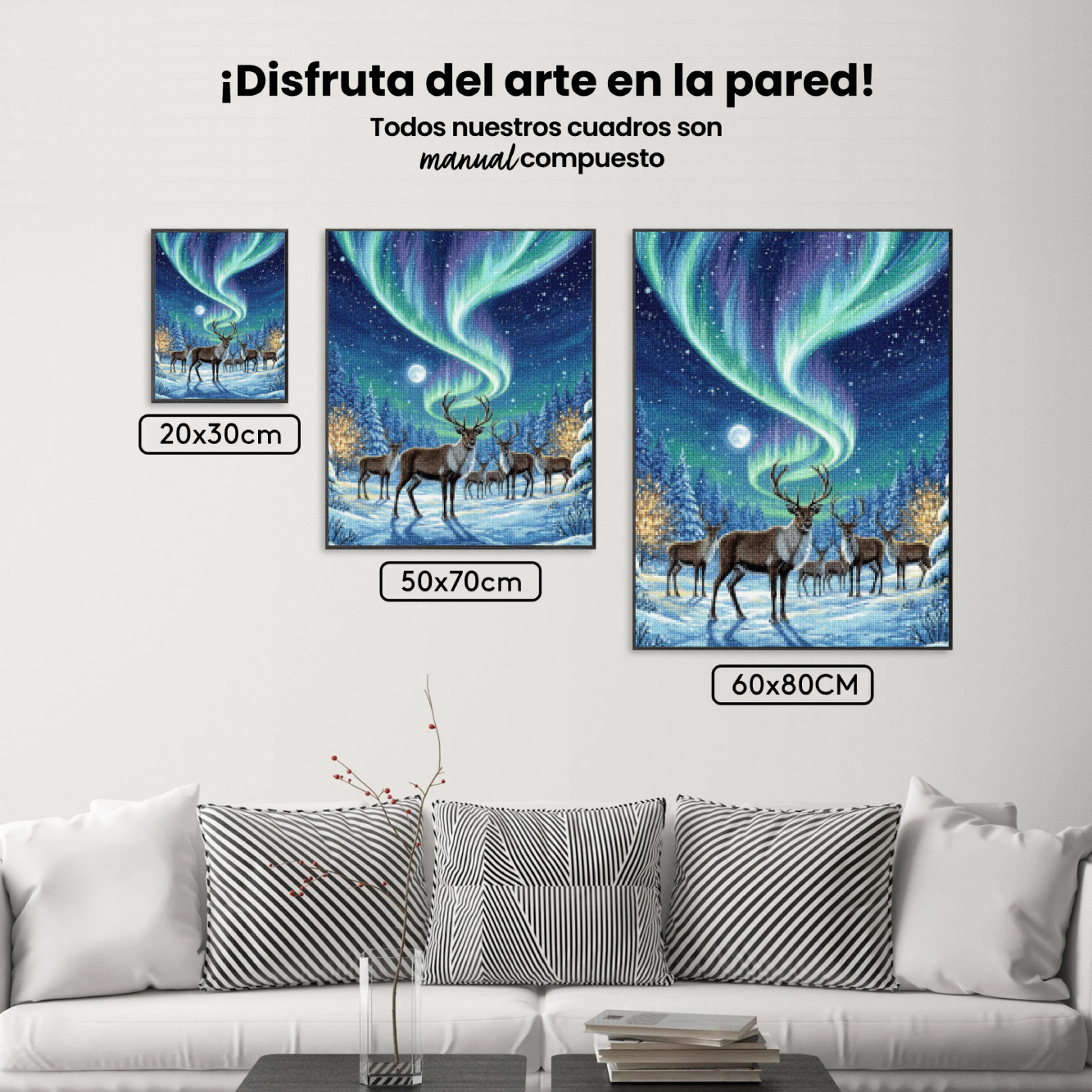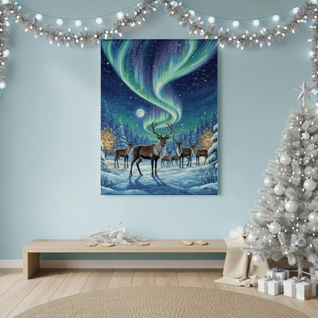 ¿Estás buscando una salida creativa, una actividad divertida para toda la familia? Esto es posible con nuestro set completo y profesional de Diamond Painting – Renos bajo la aurora boreal. Con él podrás crear los más bellos cuadros en casa. El lienzo de alta calidad y transparencia te permite realizar una obra de arte impresionante en poco tiempo. Libera tu creatividad con tus propias creaciones. Diamond Painting es el pasatiempo perfecto para ti solo o para disfrutar en familia.