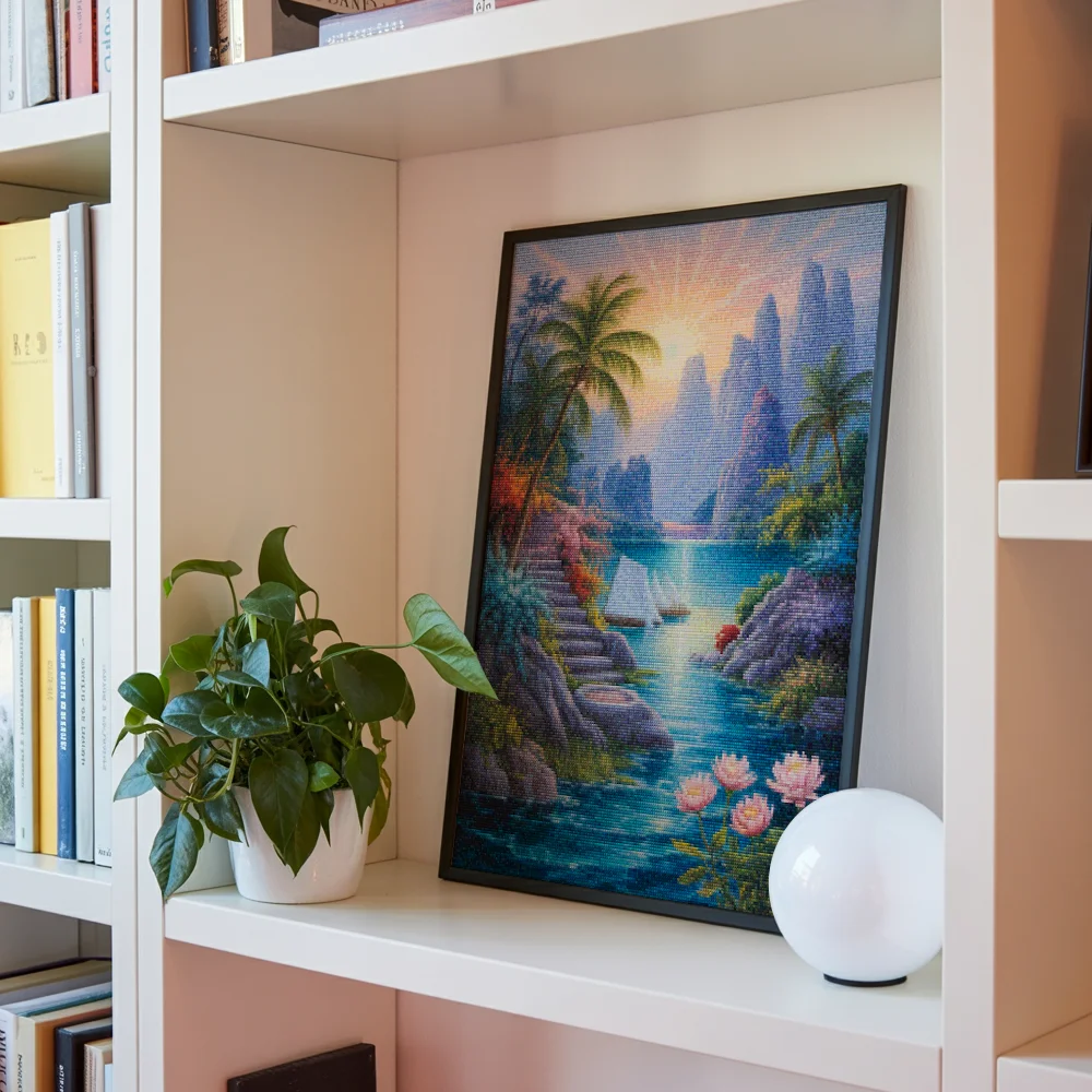 Nuestros kits de Diamond Painting son muy fáciles de usar, así que puedes comenzar a crear desde el primer momento. Antes de empezar a pintar, asegúrate de que el lienzo esté plano y sin arrugas. Alisar el lienzo facilita la colocación de las piedras y la aplicación precisa de los colores. El resto es simple: pon algo de música, enciende una serie, y ¡a pintar! Se recomienda completar primero todos los cuadros de un color antes de pasar al siguiente. Esto te permitirá no tener que limpiar el aplicador tan a menudo y lograr los mejores resultados. Una vez terminada tu pintura, déjala secar al menos un día para evitar manchas y obtener el mejor resultado. Una vez seca, puedes colgarla donde desees.