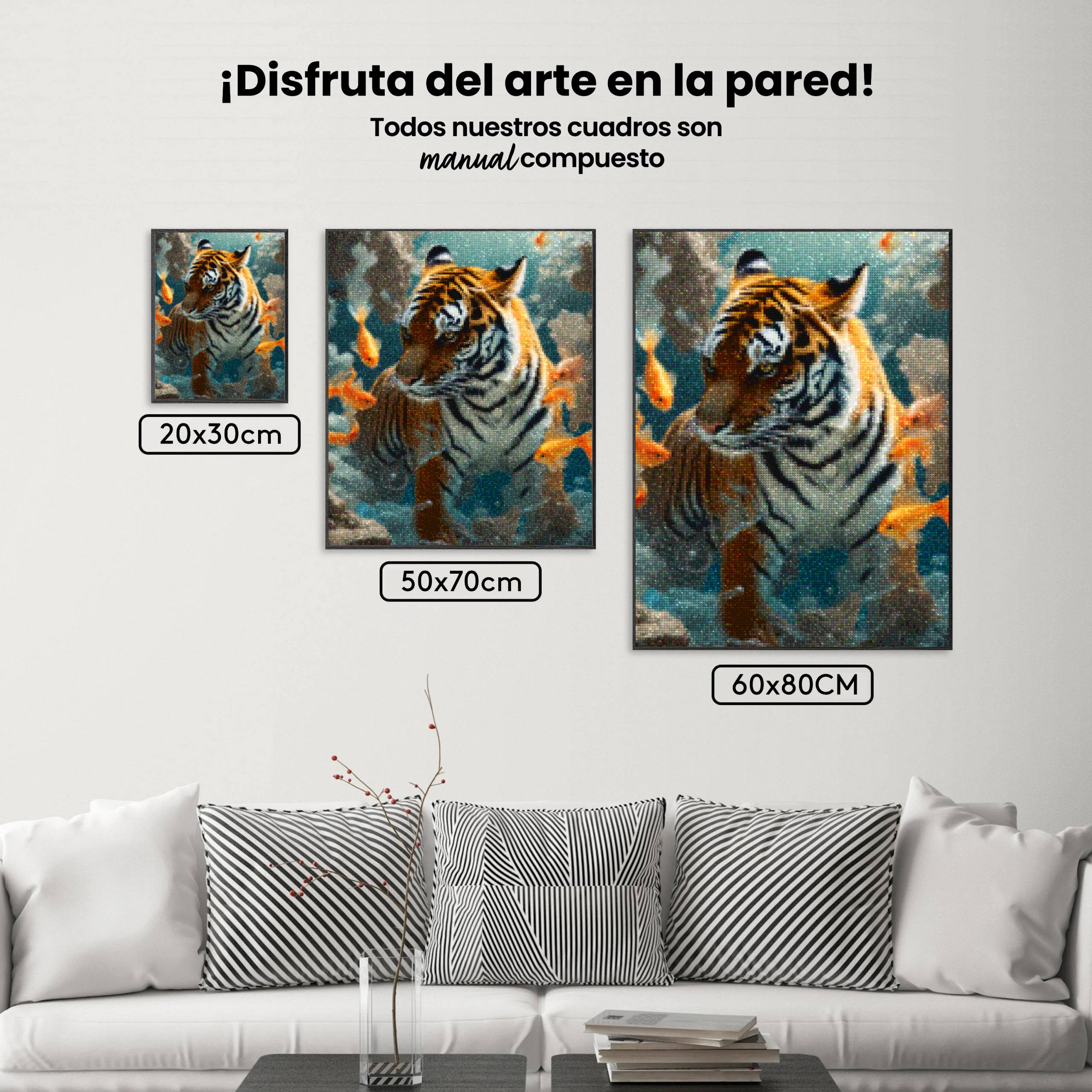 ¿Estás buscando una salida creativa, una actividad divertida para toda la familia? Esto es posible con nuestro set completo y profesional de Diamond Painting – Tigre y pez dorado. Con él podrás crear los más bellos cuadros en casa. El lienzo de alta calidad y transparencia te permite realizar una obra de arte impresionante en poco tiempo. Libera tu creatividad con tus propias creaciones. Diamond Painting es el pasatiempo perfecto para ti solo o para disfrutar en familia.